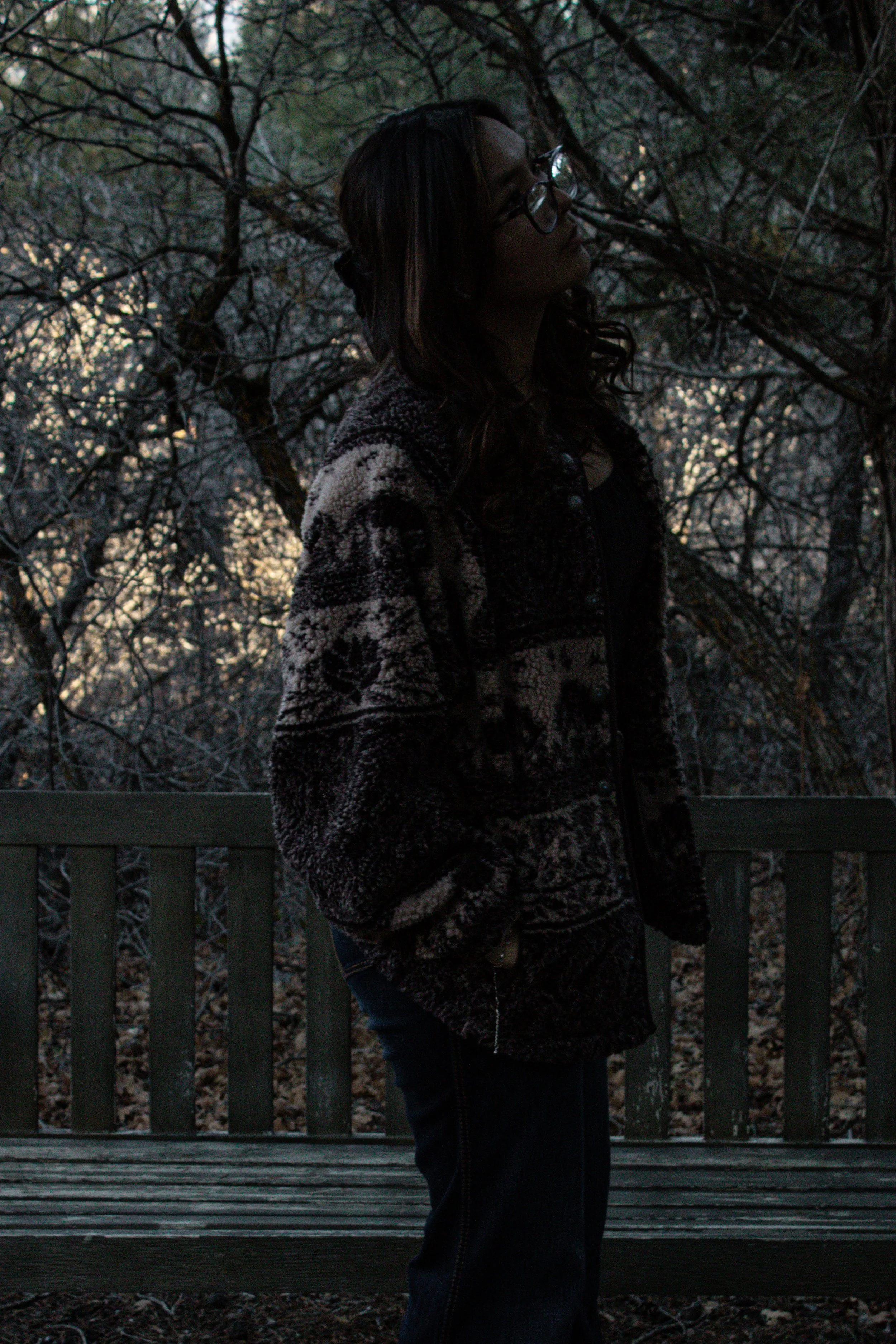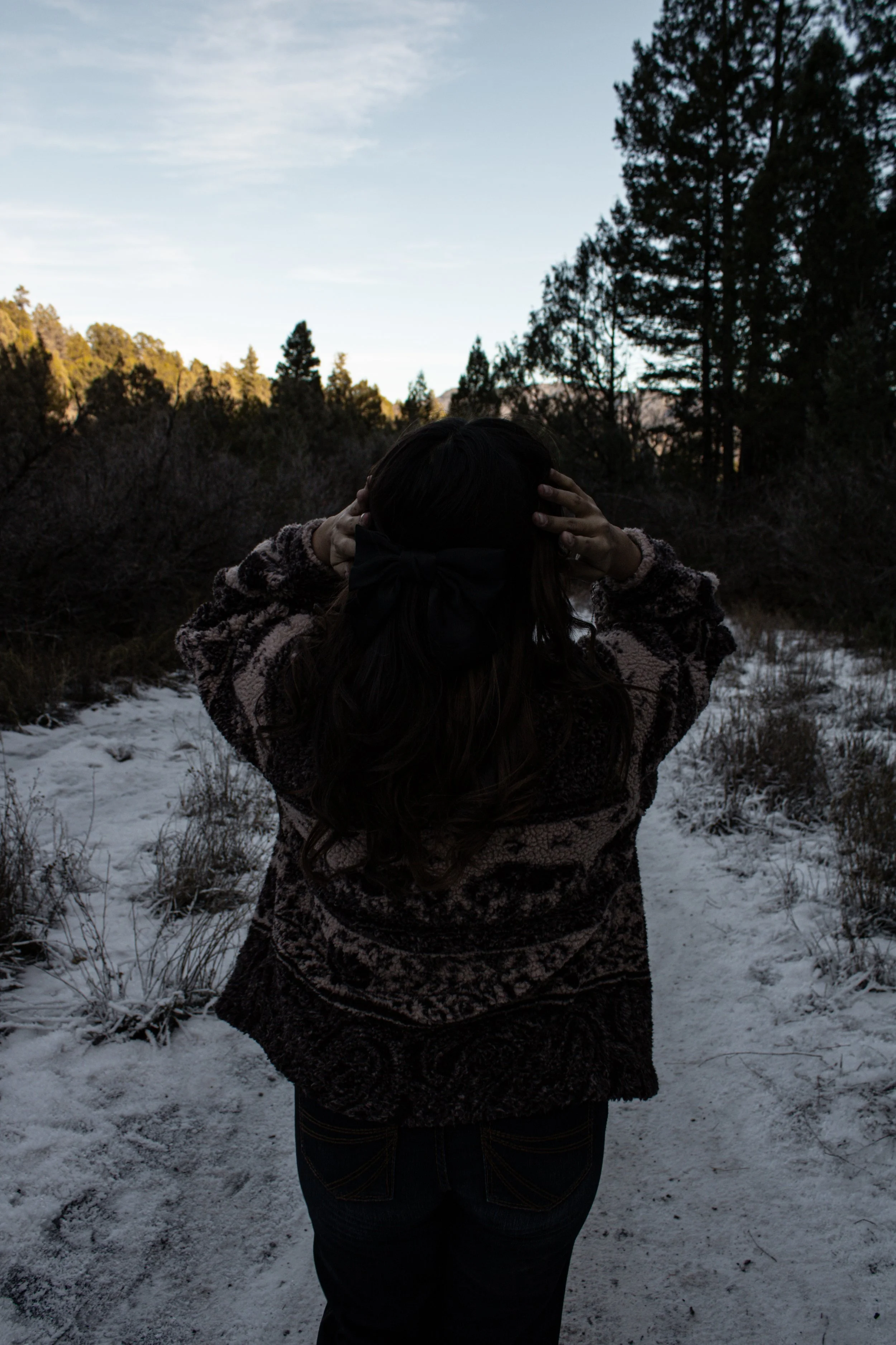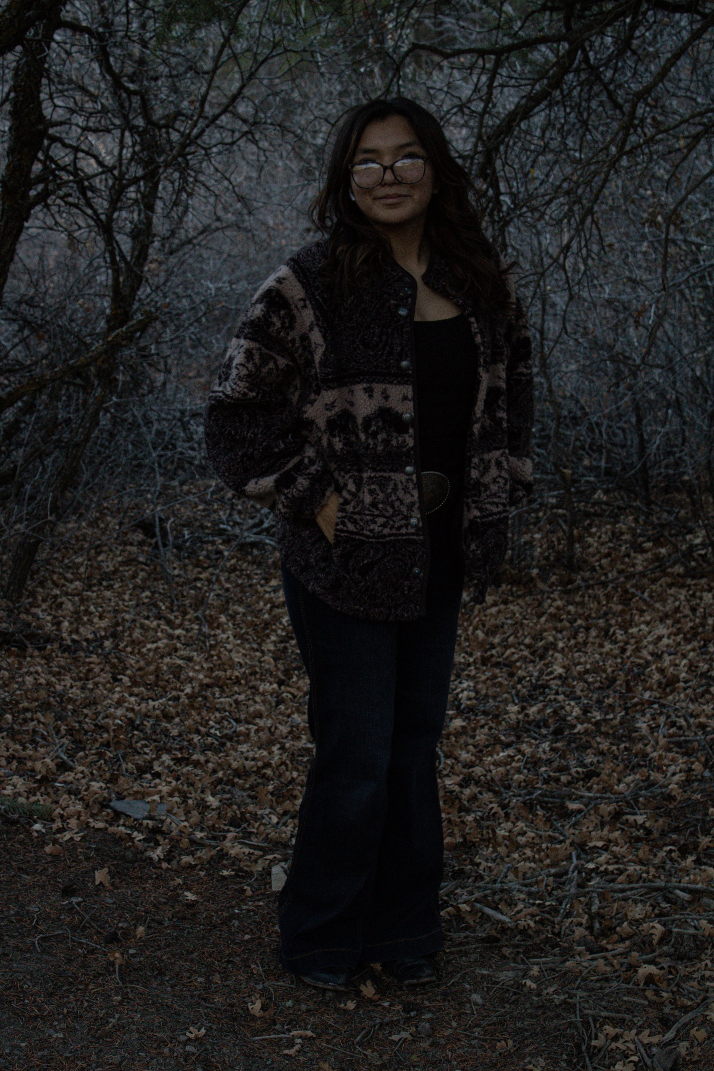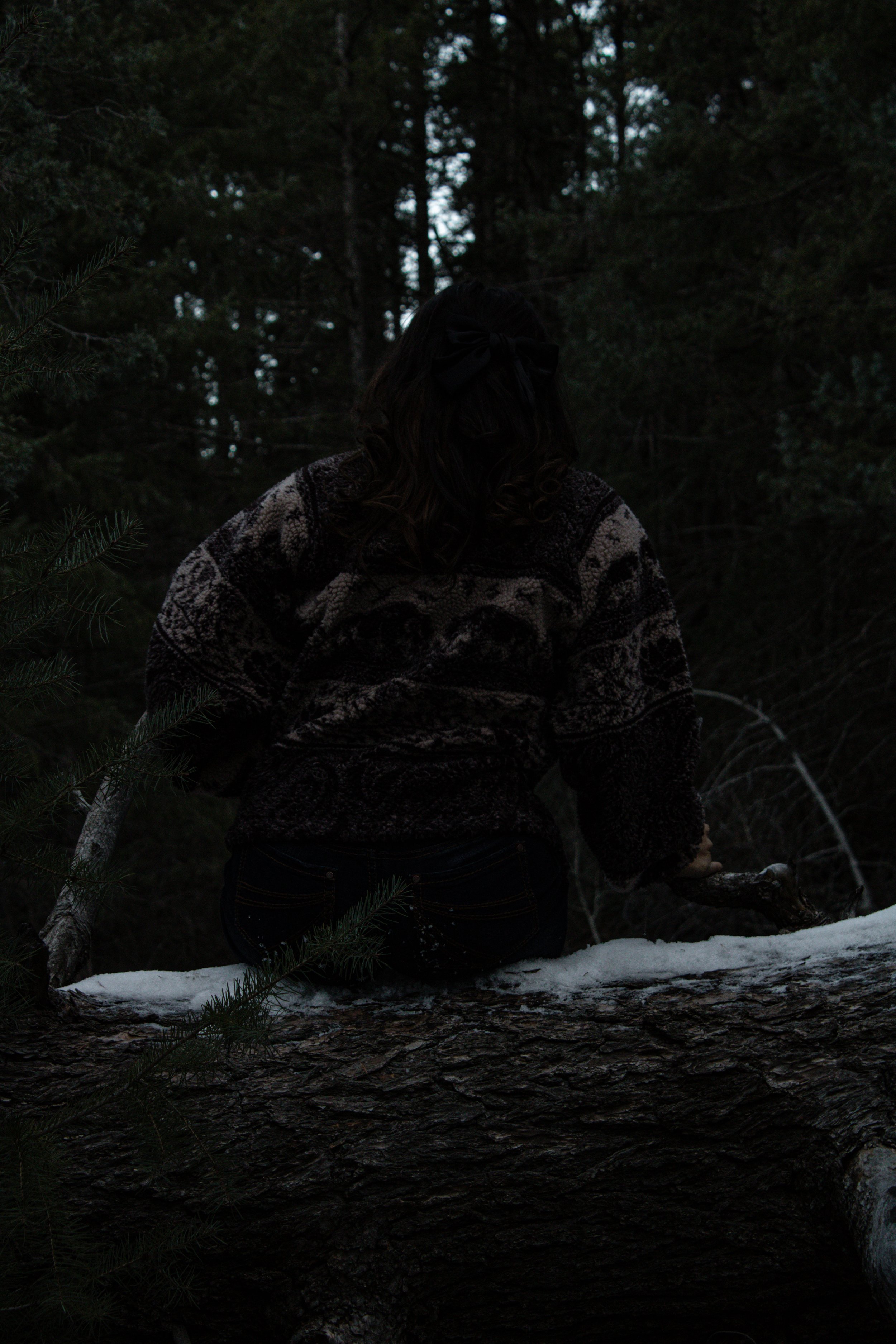 Amidst the breathtaking beauty of dark, looming mountains, a women stands, her silhouette blending with the mysterious landscape. The towering peaks and moody skies create a dramatic backdrop, highlighting her strength and grace in the face of nature’s raw power.